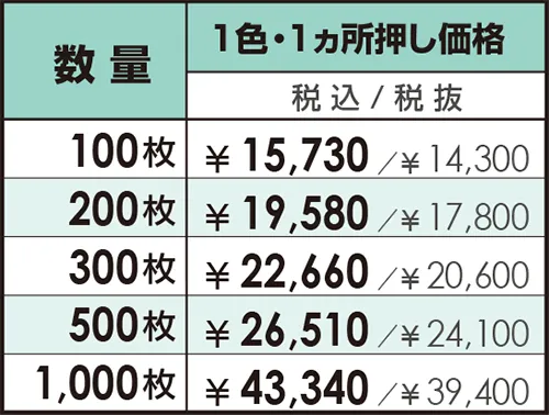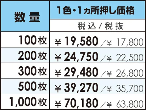 価格は箔押し印刷の価格です。2,000枚以上の大量ロット、50㎠ 以上、2ヵ所押し、フルカラー印刷の場合は別途お見積りとなります。